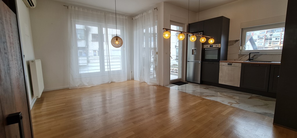 VRAPČE CENTAR, Bolnička cesta. Stan na I katu stambenog objekta sa ukupno 8 stanova. Stambena površina iznosi 61,64 m2, a sastoji se od hodnika, dnevnog boravka s blagovaonom, kuhinje, kupaonice i dvije sobe, te pripadaka stanu S4: lođa površine 3,76 m2,spremište u podrumu površine 2,92 m2 te vanjsko parkirno mjesto oznake VPM 9, u dvorištu, površine 11,50 m2. Izuzetno svijetao i ugodan životni prostor, natprosječne visine- 3m, sa EC u razredu B. Režijski troškovi su izuzetno niski. Grijanje je centralno etažno na plin, klimatiziran. Stan je djelomično opremljen i namješten - ugradbeni ormar u jednoj od soba (dimenzije 5m x 3m x0,8M), kompletno opremljena kuhinja (visokokvalitetna sa svim aparatima). Odlična lokacija u blizini svih važnih sadržaja- osnovna škola i tržnica u neposrednoj blizini, dom zdravlja na samo 5 minuta udaljenosti, stanice autobusnih linija i stanice vlaka.